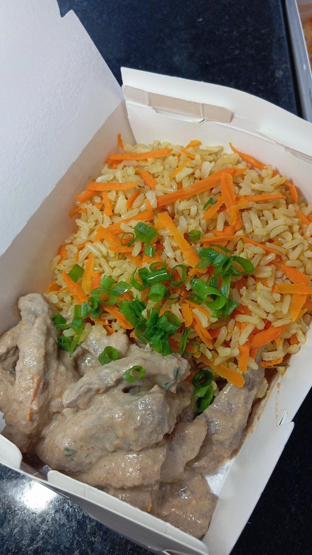 Estrogonofe de carne com arroz integral e cenoura ralada quantidade