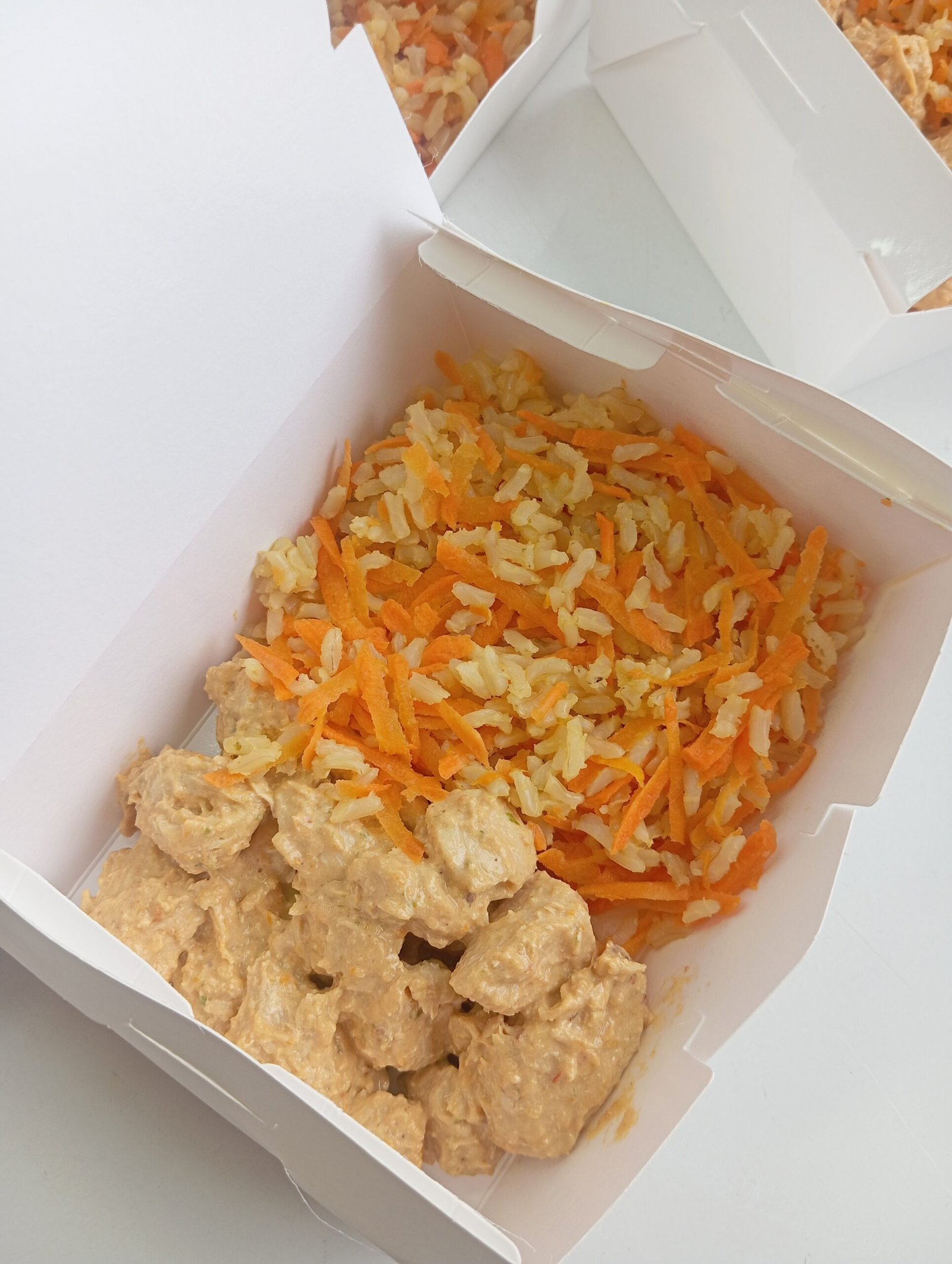 Feito com tempero caseiro, frango suculento e arroz soltinho com cenoura ralada.
